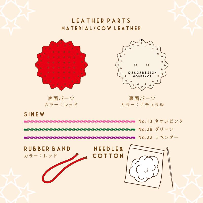 モノ作りをお気軽にお楽しみ頂けるOJAGA KIT。イベントでお馴染みのワークショップアイテムをパッケージング。自分だけのオリジナルレザーアイテムがお作り頂けるキットです。レザーパーツには縫い穴が開いており、針とシニュー糸が同封されているので、専用の道具などが必要なく、届いてすぐにお楽しみいただけます。※写真5枚目は完成イメージです。完成品はパッケージに含まれません。