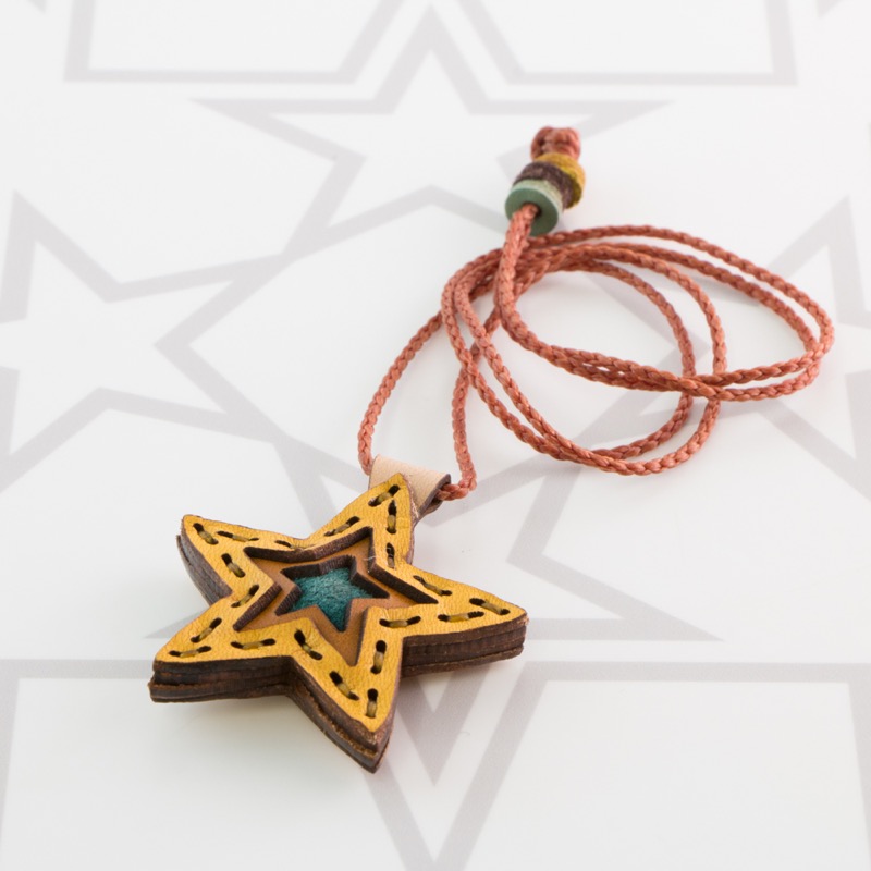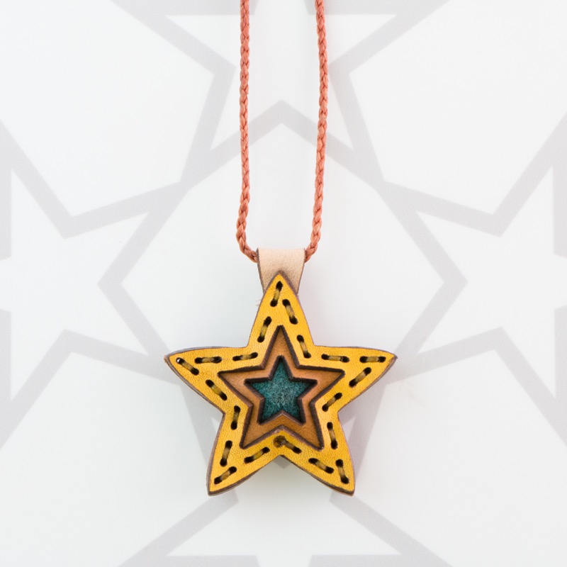 スエードのターコイズカラーとカウレザーのイエローを組み合わせた「NGHT OF EARTH COLLECTION」五芒星をデザインしたネックレスです。三枚の革を重ねた存在感のある仕上がりは、ファッションのアクセントに最適です。紐部分のレザービーズで紐をお好みの長さに調整出来る仕様となっております。