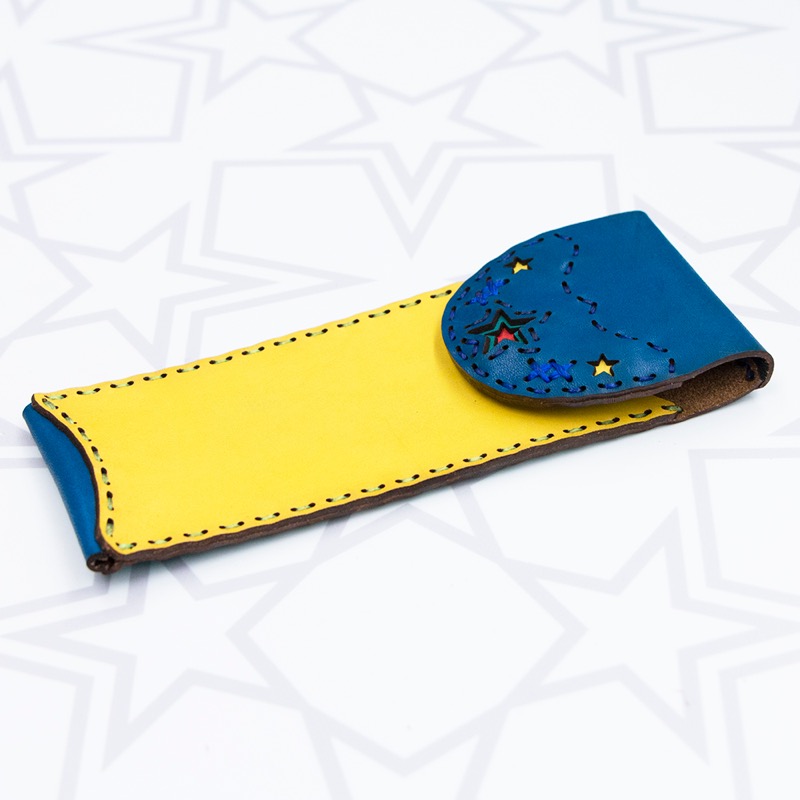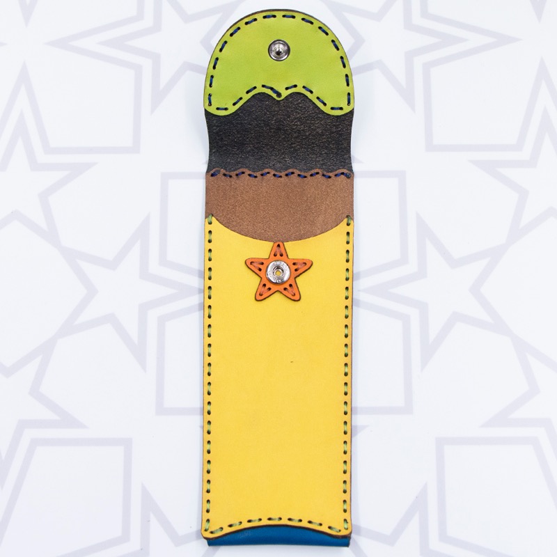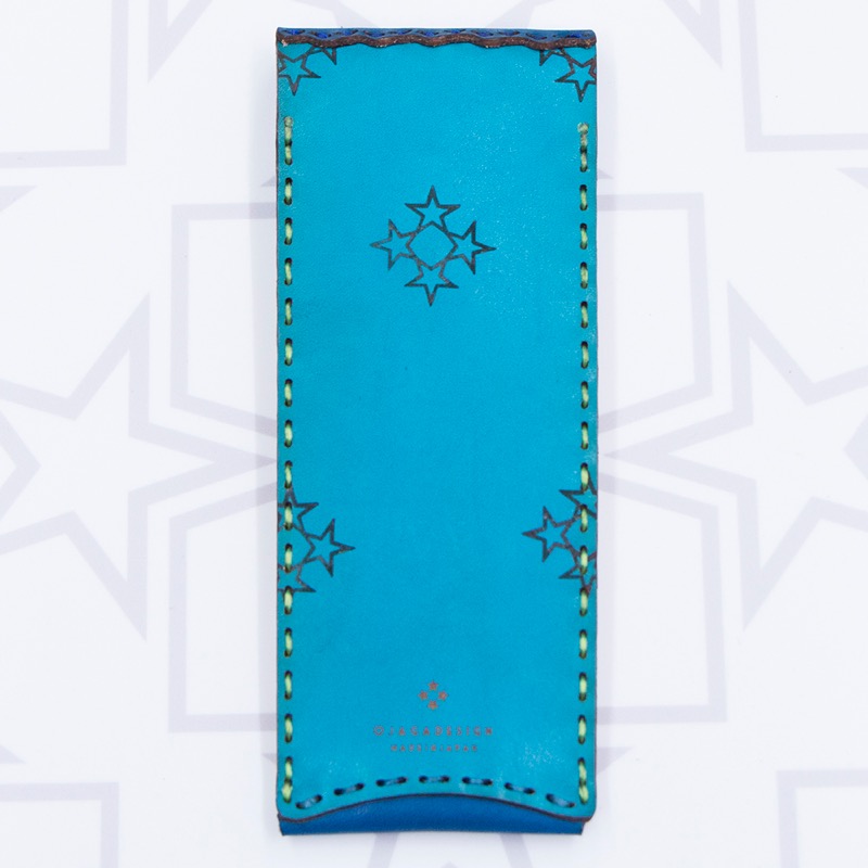 スマートなペンケースです。ペンを3本収納可能なすっきりとした仕上がりは、ビジネスシーンにもおすすめ。レザーを重ねた五芒星とクロスステッチをあしらい、他にはないデザインが魅力的な仕上がりです。ボタン部分の五芒星もポイント。