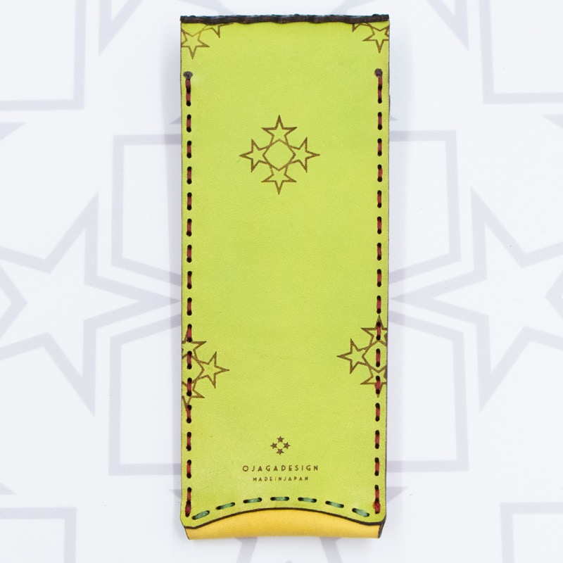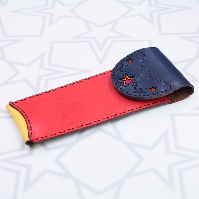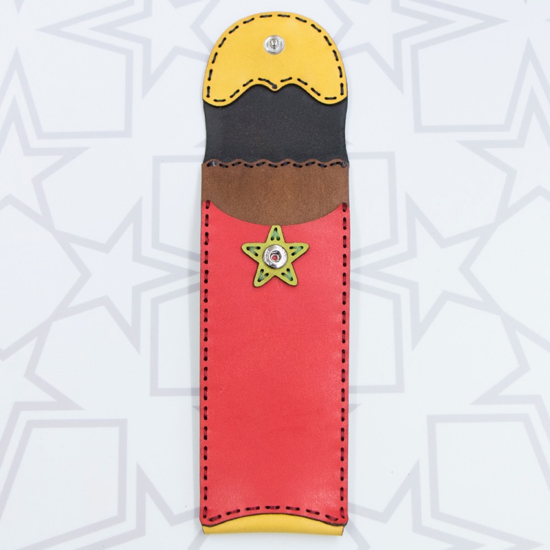 スマートなペンケースです。ペンを3本収納可能なすっきりとした仕上がりは、ビジネスシーンにもおすすめ。レザーを重ねた五芒星とクロスステッチをあしらい、他にはないデザインが魅力的な仕上がりです。ボタン部分の五芒星もポイント。