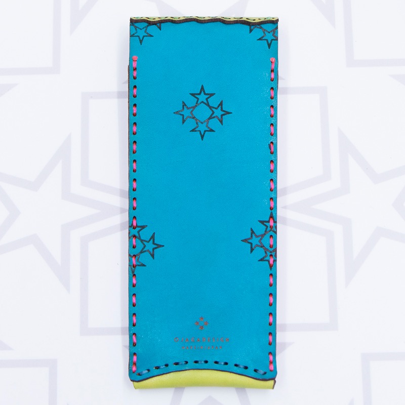 スマートなペンケースです。ペンを3本収納可能なすっきりとした仕上がりは、ビジネスシーンにもおすすめ。レザーを重ねた五芒星とクロスステッチをあしらい、他にはないデザインが魅力的な仕上がりです。ボタン部分の五芒星もポイント。