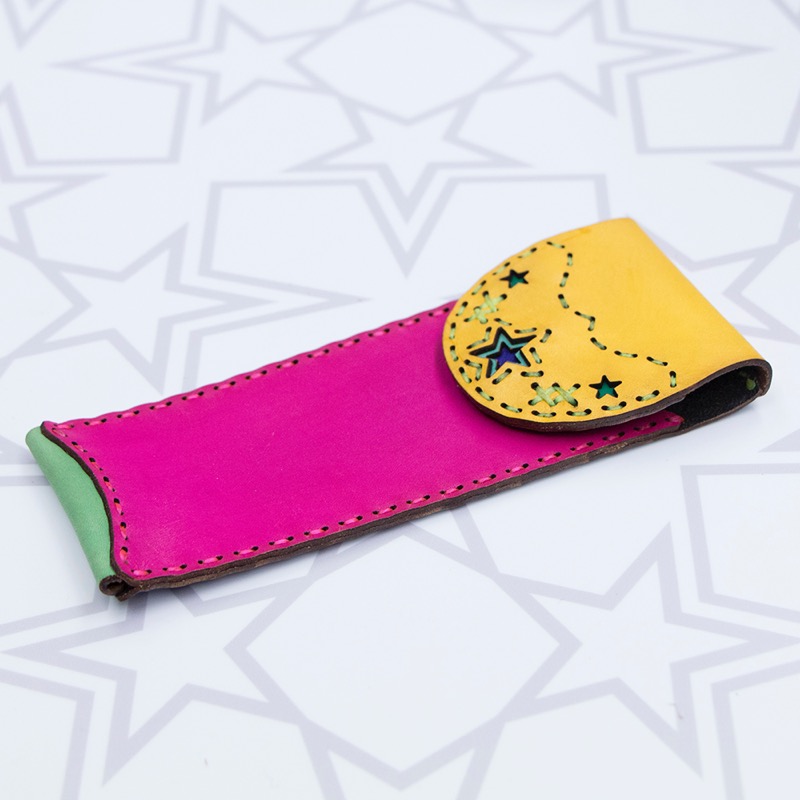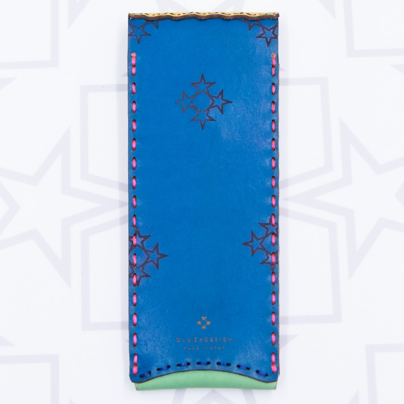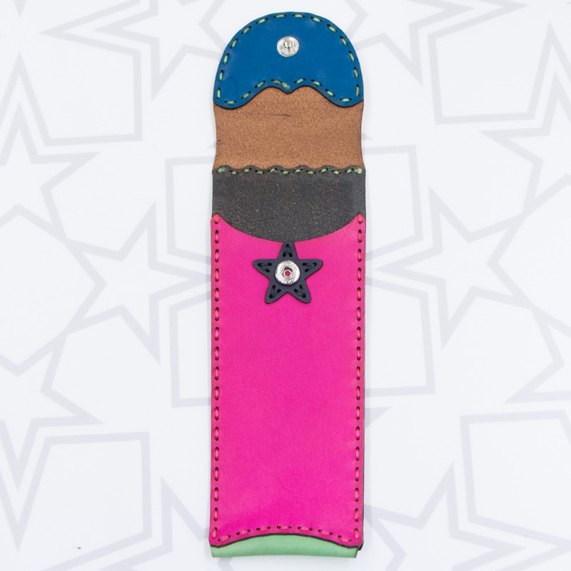 スマートなペンケースです。ペンを3本収納可能なすっきりとした仕上がりは、ビジネスシーンにもおすすめ。レザーを重ねた五芒星とクロスステッチをあしらい、他にはないデザインが魅力的な仕上がりです。ボタン部分の五芒星もポイント。
