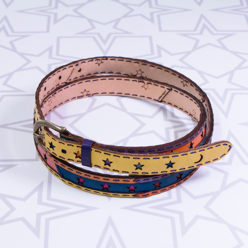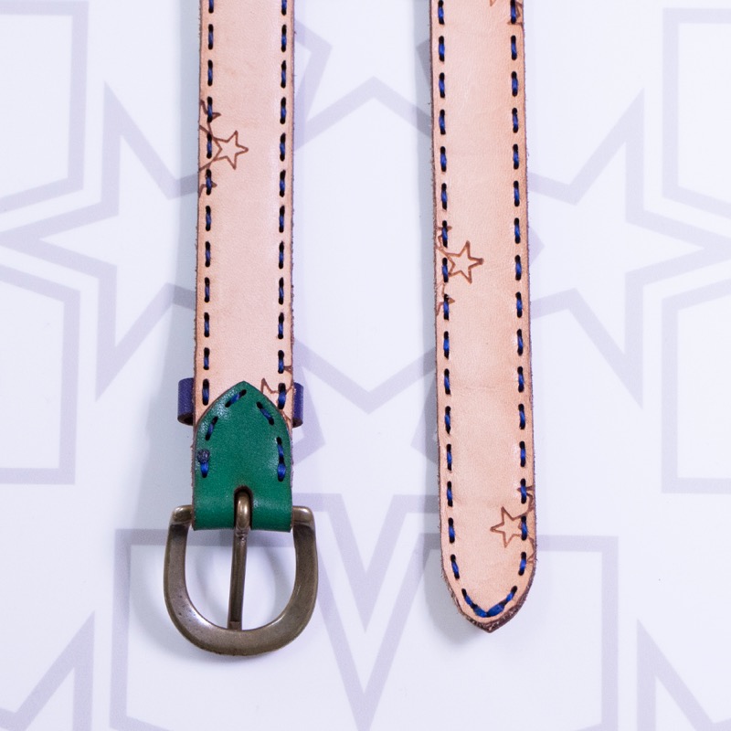 カラフルな五芒星が目を惹くベルトは、すっきりとした細幅タイプ。たくさんのカラーを組み合わせた、他にはないオジャガデザインらしい仕上がりとなりました。裏側にはオジャガスターの焼き印を施し、細部までこだわったデザインに。SとMの2サイズ展開となります。
