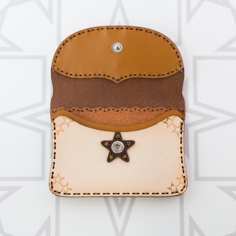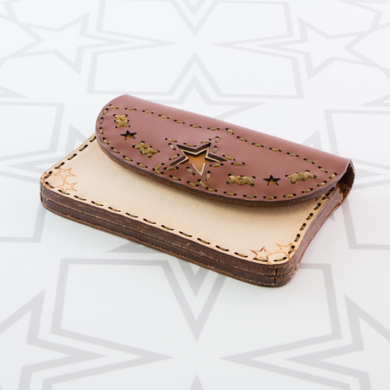 名刺入れとしてもお使い頂けるカードケースです。独特の風合いを楽しめるアイテムとなりました。二ヶ所のポケットが付いているので名刺交換の際にも便利にお使いいただけます。開閉はスナップボタンタイプで使いやすく、約20枚の名刺の収納が可能。レザーを重ねた五芒星とクロスステッチをあしらい、他にはないデザインに。ボタン部分の五芒星もポイントです。