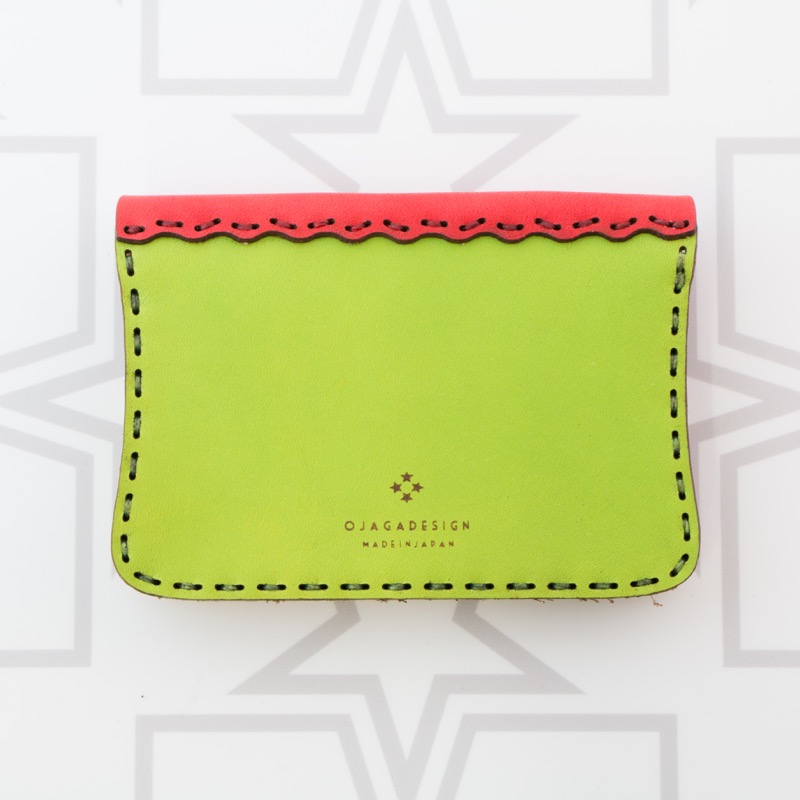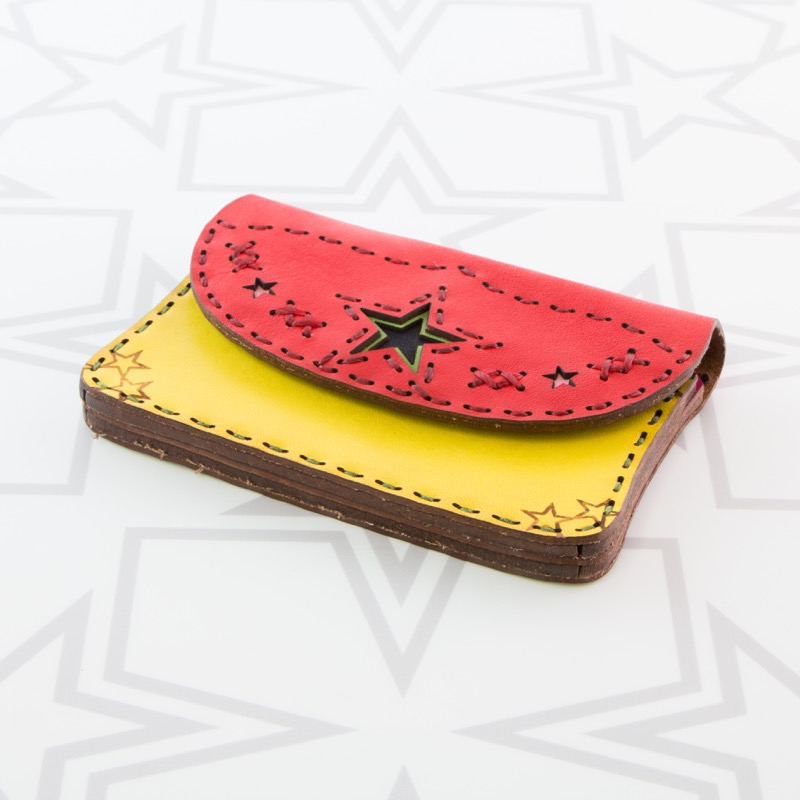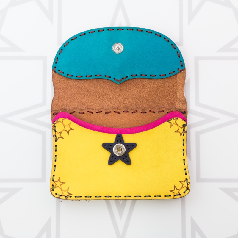 名刺入れとしてもお使い頂けるカードケースです。独特の風合いを楽しめるアイテムとなりました。二ヶ所のポケットが付いているので名刺交換の際にも便利にお使いいただけます。開閉はスナップボタンタイプで使いやすく、約20枚の名刺の収納が可能。レザーを重ねた五芒星とクロスステッチをあしらい、他にはないデザインに。ボタン部分の五芒星もポイントです。