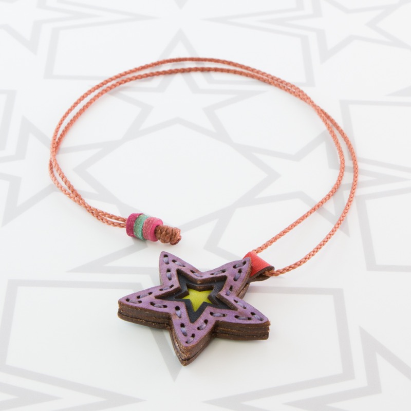五芒星をデザインしたネックレスです。三枚の革を重ねた存在感のある仕上がりは、ファッションのアクセントに最適です。表裏それぞれ異なったカラーリングなので、リバーシブルでお楽しみ頂けます。紐部分のレザービーズで紐をお好みの長さに調整出来る仕様となっております。