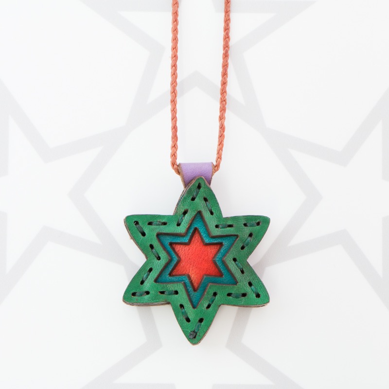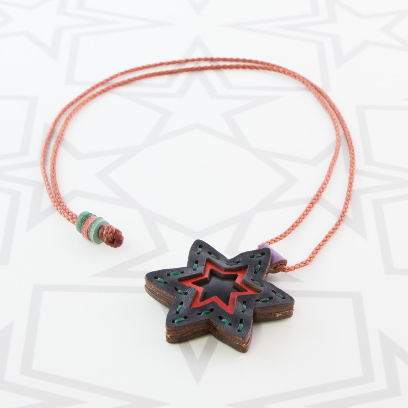 六芒星をデザインしたネックレスです。三枚の革を重ねた存在感のある仕上がりは、ファッションのアクセントに最適です。表裏それぞれ異なったカラーリングなので、リバーシブルでお楽しみ頂けます。紐部分のレザービーズで紐をお好みの長さに調整出来る仕様となっております。