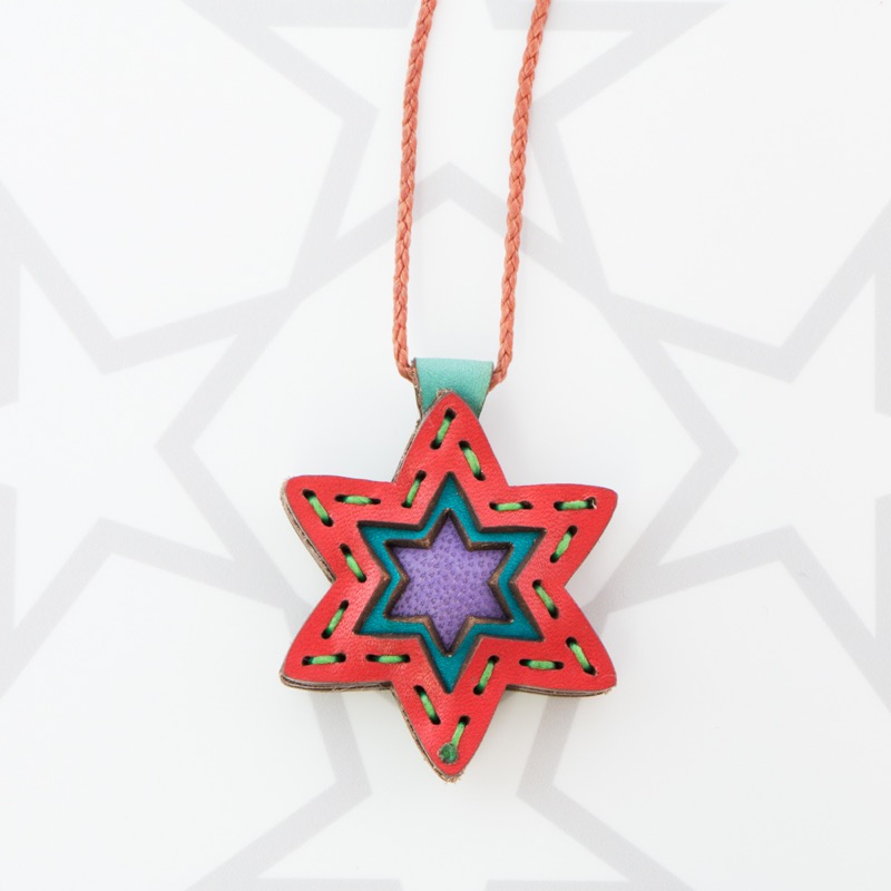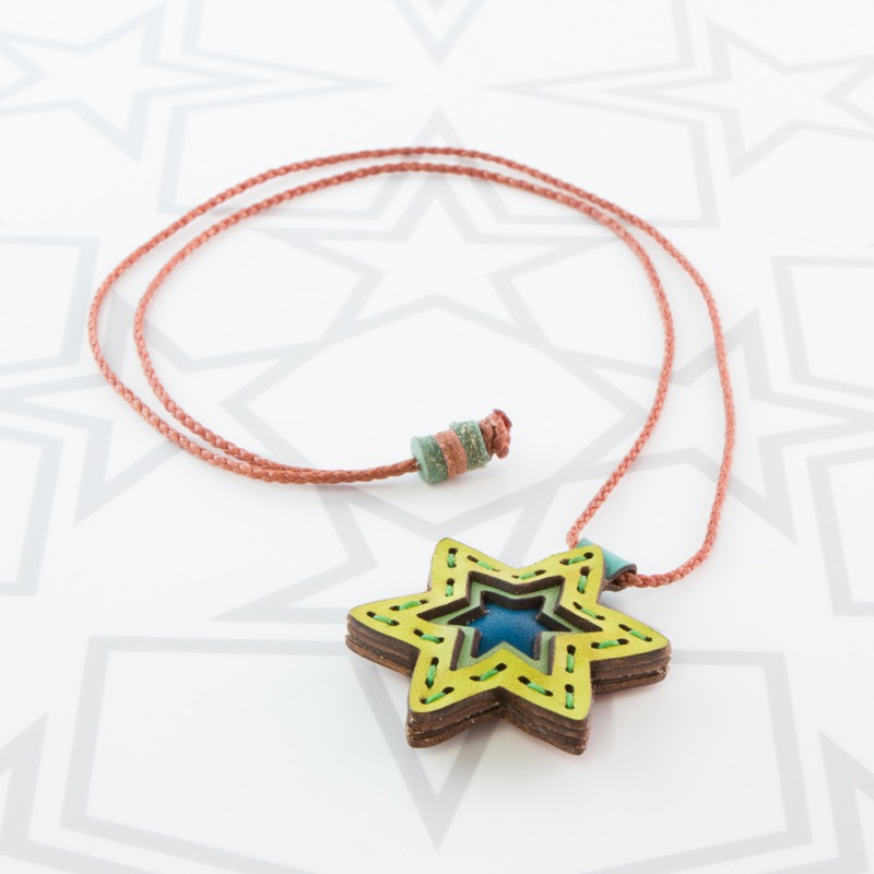 六芒星をデザインしたネックレスです。三枚の革を重ねた存在感のある仕上がりは、ファッションのアクセントに最適です。表裏それぞれ異なったカラーリングなので、リバーシブルでお楽しみ頂けます。紐部分のレザービーズで紐をお好みの長さに調整出来る仕様となっております。