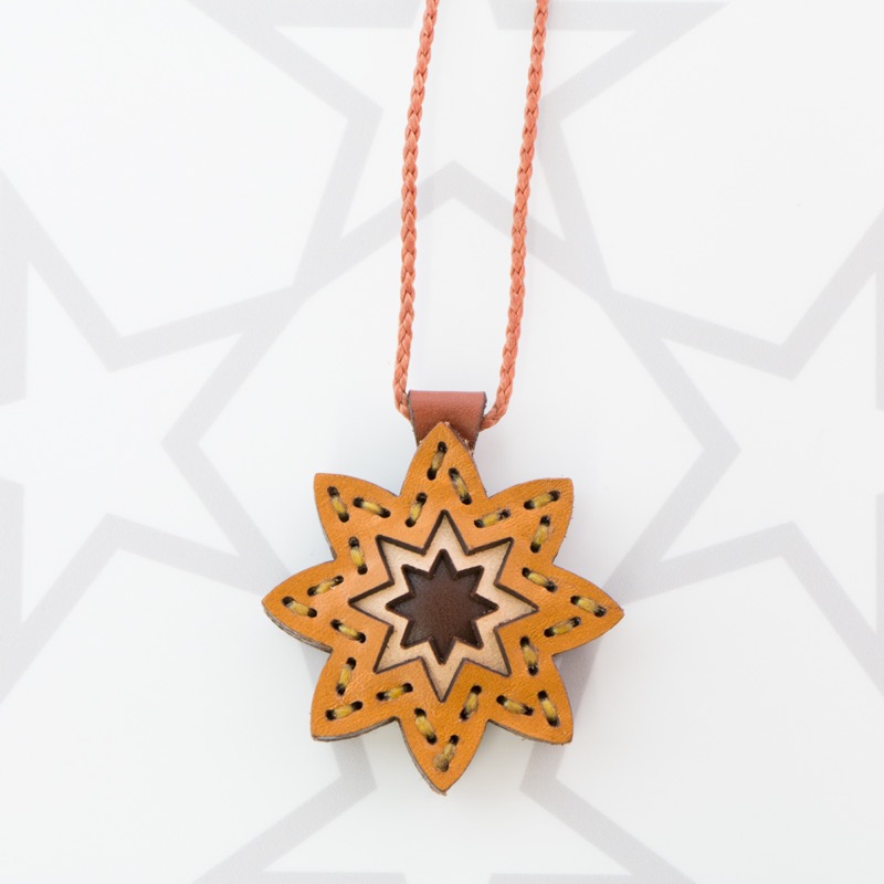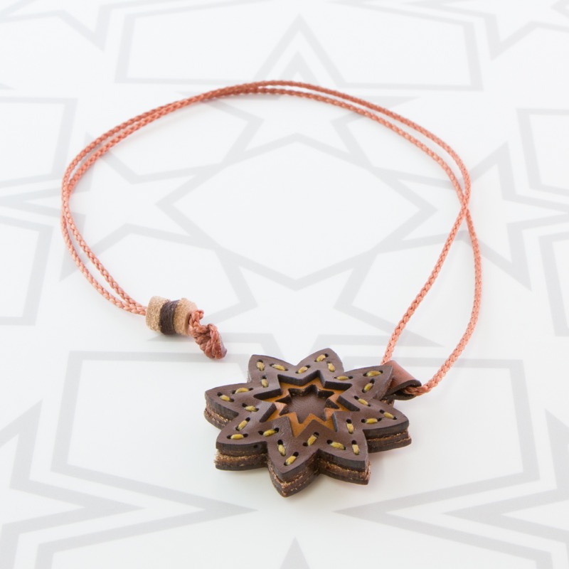 八芒星をデザインしたネックレスです。三枚の革を重ねた存在感のある仕上がりは、ファッションのアクセントに最適です。表裏それぞれ異なったカラーリングなので、リバーシブルでお楽しみ頂けます。紐部分のレザービーズで紐をお好みの長さに調整出来る仕様となっております。
