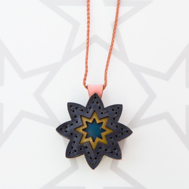 八芒星をデザインしたネックレスです。三枚の革を重ねた存在感のある仕上がりは、ファッションのアクセントに最適です。表裏それぞれ異なったカラーリングなので、リバーシブルでお楽しみ頂けます。紐部分のレザービーズで紐をお好みの長さに調整出来る仕様となっております。