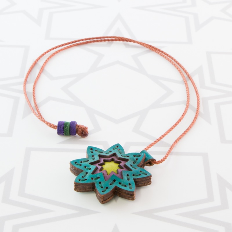 八芒星をデザインしたネックレスです。三枚の革を重ねた存在感のある仕上がりは、ファッションのアクセントに最適です。表裏それぞれ異なったカラーリングなので、リバーシブルでお楽しみ頂けます。紐部分のレザービーズで紐をお好みの長さに調整出来る仕様となっております。