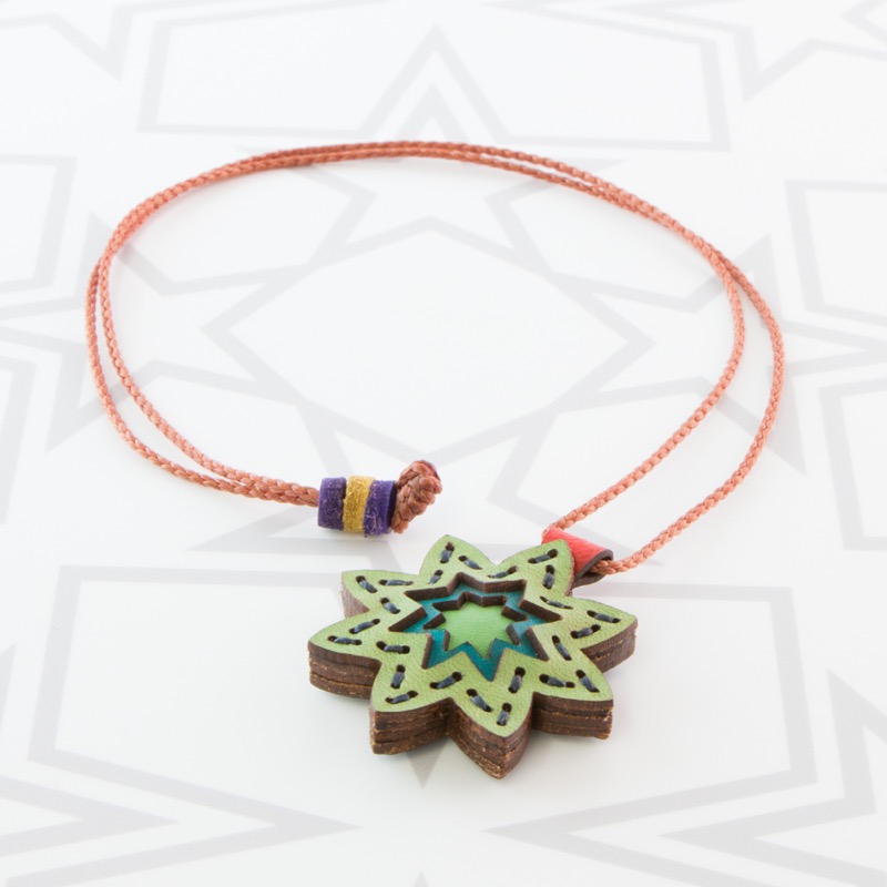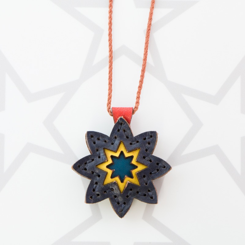 八芒星をデザインしたネックレスです。三枚の革を重ねた存在感のある仕上がりは、ファッションのアクセントに最適です。表裏それぞれ異なったカラーリングなので、リバーシブルでお楽しみ頂けます。紐部分のレザービーズで紐をお好みの長さに調整出来る仕様となっております。