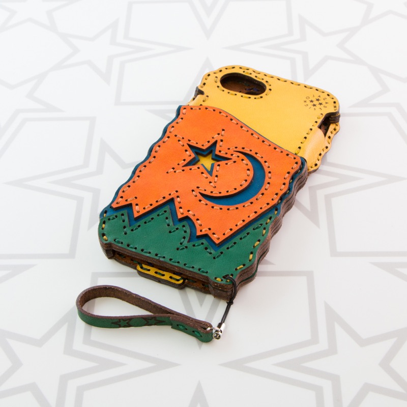 月星モチーフをデザインしたiPhone6/7/8ケースです。ポケット部分は空に浮かぶ月星と山をデザインし、風景画のような幻想的な仕上がりに。星の部分がくり抜きになっており、ポケットにカードを入れると一味違った表情を楽しめます。iPhone本体をしっかりと覆うことが出来、側面にもレザーを使用することで保護性を高め、ウェーブ状のカットを施すことで持ちやすさも重視。ホームボタン部分は押しやすいよう広めの作りになっております。