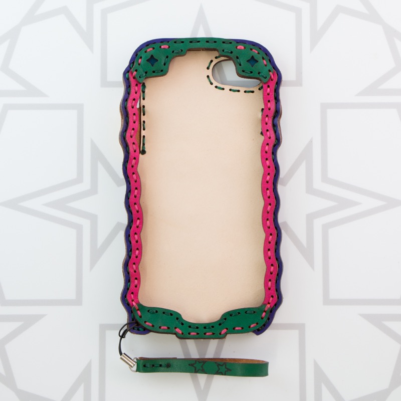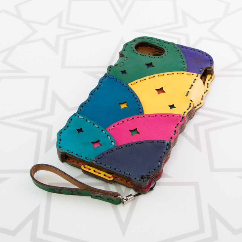 パッチワークデザインのiPhone6/7/8ケースです。幾重にも折り重なるパッチワークにキラキラと輝く四つ星のくり抜きをランダムに配置し、たくさんの色を楽しめるデザインになりました。iPhone本体をしっかりと覆うことが出来、側面にもレザーを使用することで保護性を高め、ウェーブ状のカットを施すことで持ちやすさも重視。ホームボタン部分は押しやすいよう広めの作りになっております。