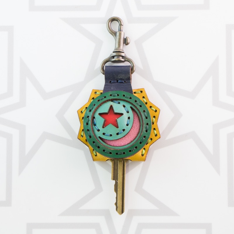 月と星がデザインされたキーキャップです。丸いフラップ部分とは対照的なギザギザした背面が特徴です。お手持ちの鍵をおしゃれに彩るだけでなく鍵の目印にもなり、便利なナスカン付きなので、ベルトループ、キーホルダー、ファスナーなどに着けて紛失防止にも役立ちます。
