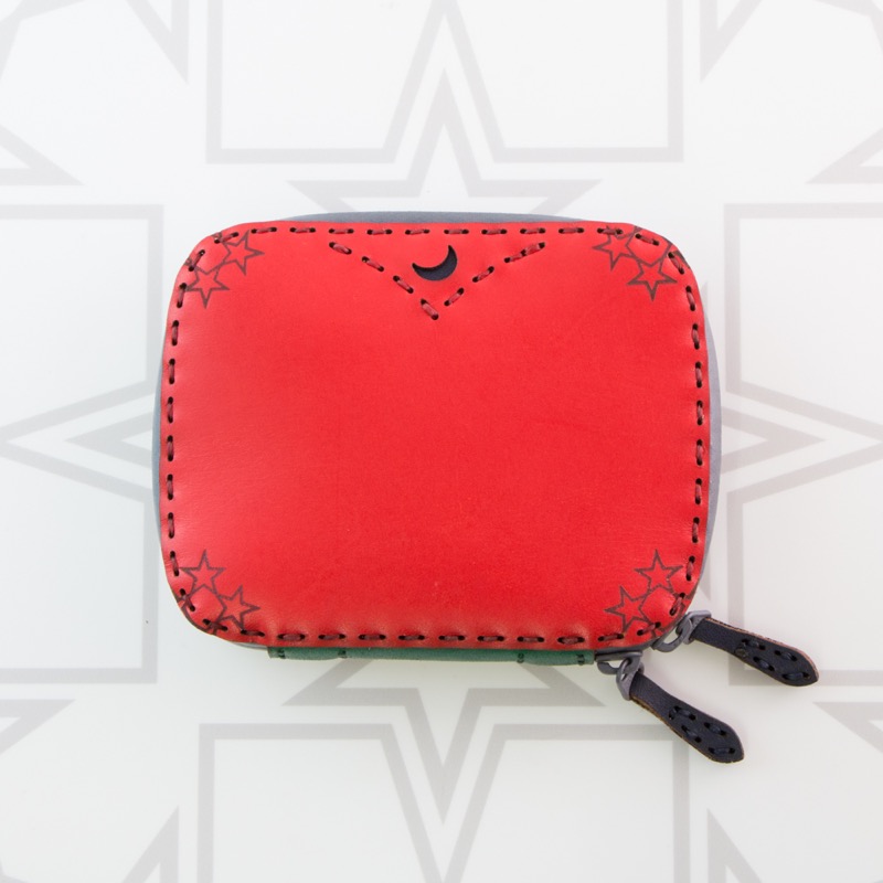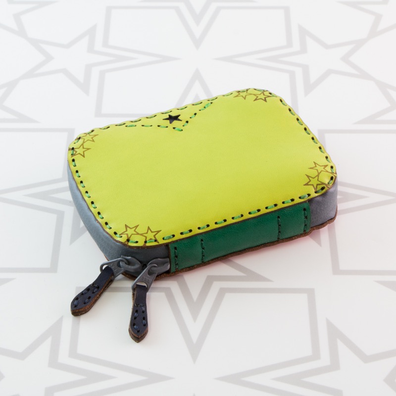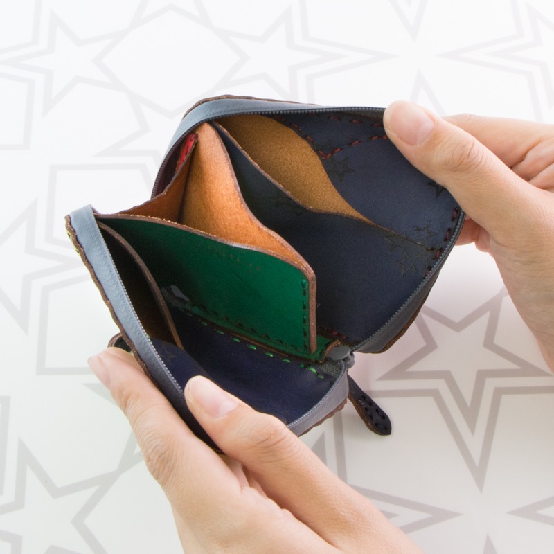 月と星、V字のステッチを施したラウンドジップタイプのミニウォレットです。