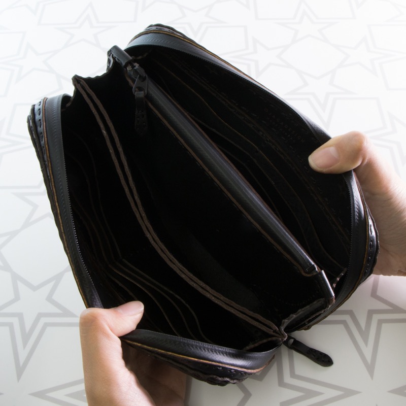 大きく開くダブルジップで中が見やすく、カードポケットが16箇所、ポケットが3箇所、中仕切りが2つ付き、コインケースはたっぷり入るジップタイプで収納力抜群の仕上がりになりました。