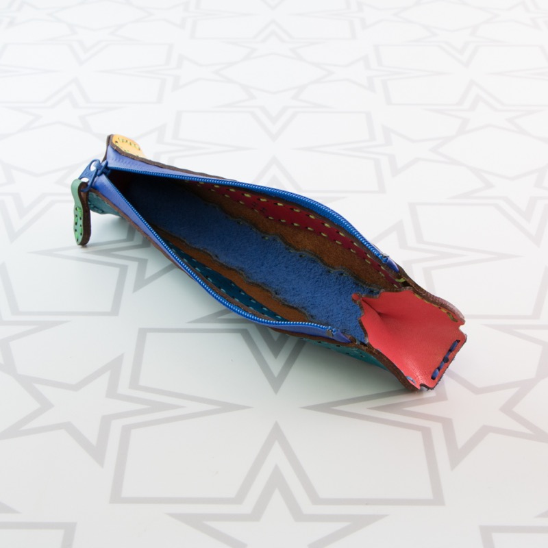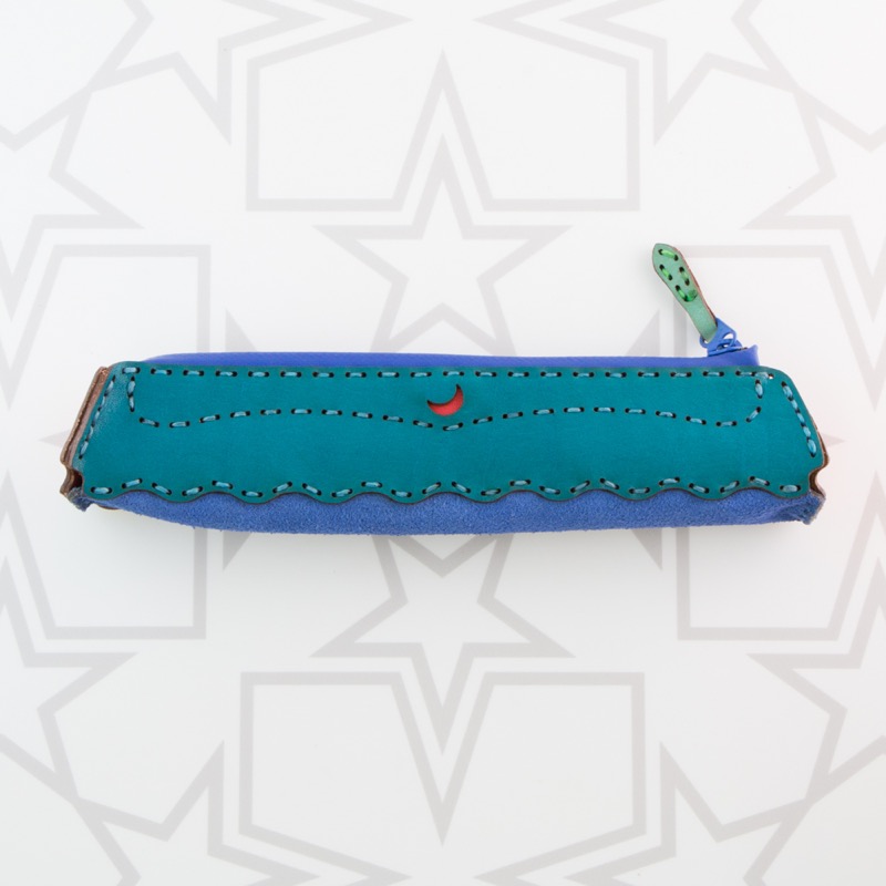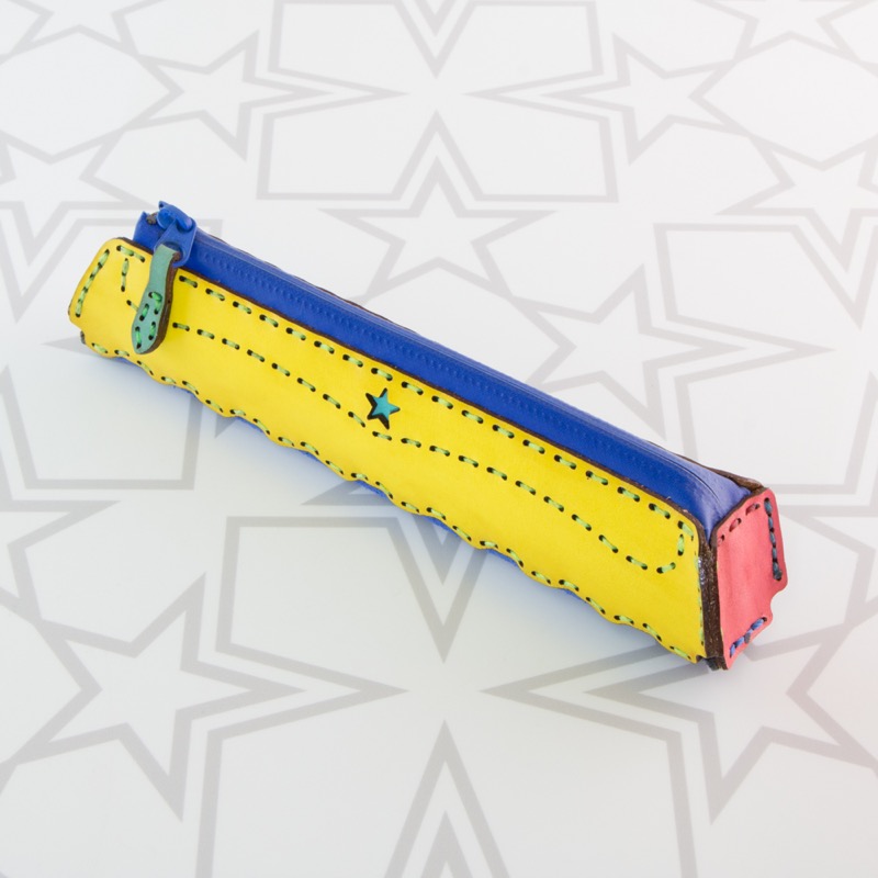 ジップタイプのペンケースがです。バッグの中で邪魔にならないコンパクトなサイズで、数本持ち歩きたい方にぴったりのスッキリとしたデザインになりました。ボールペンが約5本入り、大きく開くジップタイプなので中も見やすい作りとなっております。小さな月星と波型カットでオジャガデザインらしい仕上がりです。