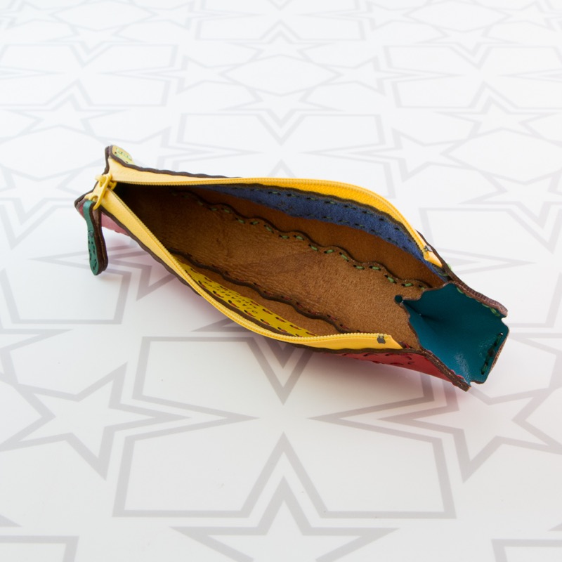 ジップタイプのペンケースがです。バッグの中で邪魔にならないコンパクトなサイズで、数本持ち歩きたい方にぴったりのスッキリとしたデザインになりました。ボールペンが約5本入り、大きく開くジップタイプなので中も見やすい作りとなっております。小さな月星と波型カットでオジャガデザインらしい仕上がりです。