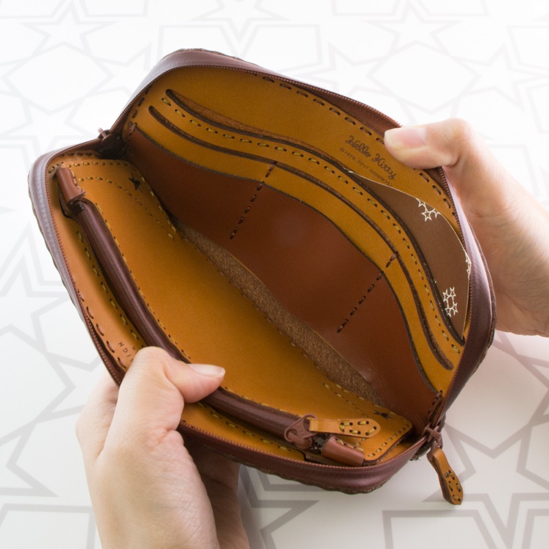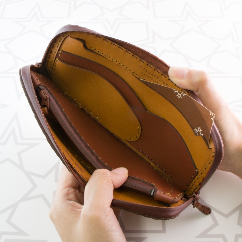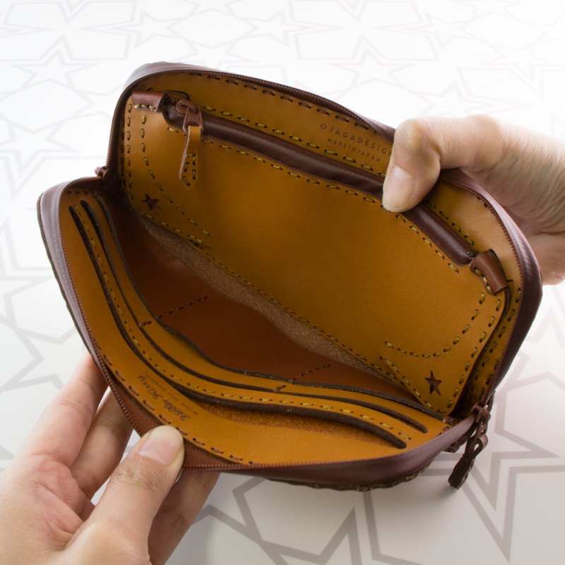 丸みを帯びた折り重なるポケットや弧を描くカット、コインケースに隠れた五芒星など、中のデザインにも遊び心を取り入れました。