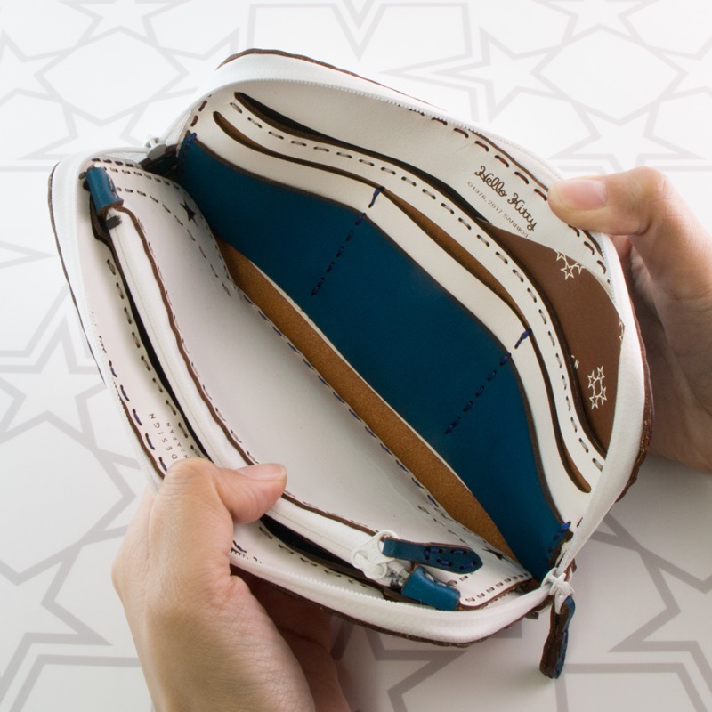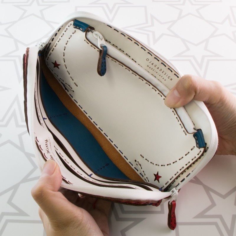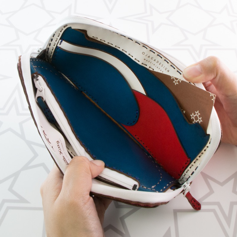 丸みを帯びた折り重なるポケットや弧を描くカット、コインケースに隠れた五芒星など、中のデザインにも遊び心を取り入れました。