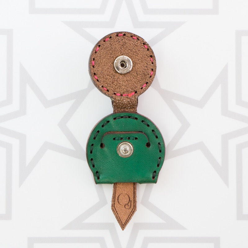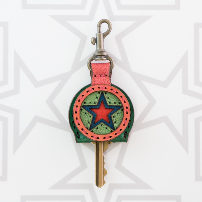 五芒星がデザインされたキーキャップです。丸いフォルムの真ん中に星を配置し、ステッチで縁取った印象的な仕上がりです。お手持ちの鍵をおしゃれに彩るだけでなく鍵の目印にもなり、便利なナスカン付きなので、ベルトループ、キーホルダー、ファスナーなどに着けて紛失防止にも役立ちます。
