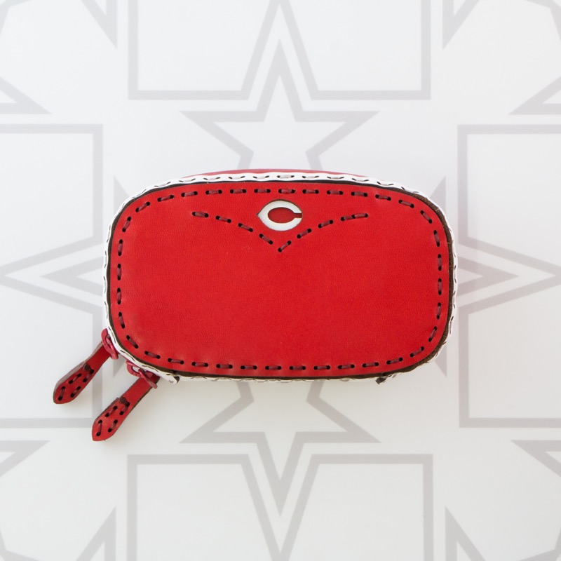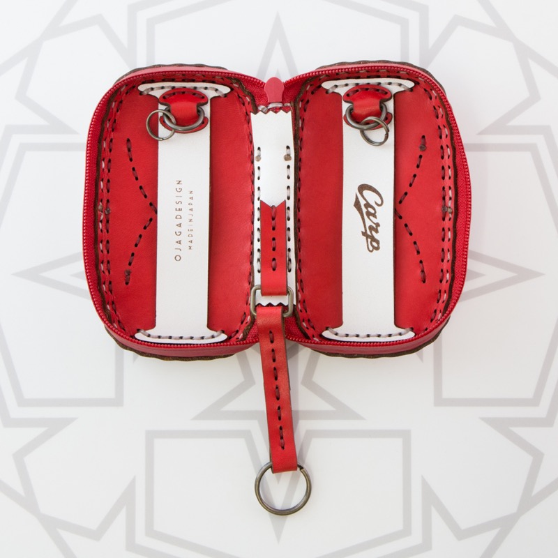 広島東洋カープとのコラボアイテム。真っ赤な球団カラーを基調としたボディに球団ロゴのCマークを両面に配置したキーケースです。ダブルジップのラウンドファスナーと厚めのマチを付けることで中身を大切に保護するだけでなく、たくさんの鍵はもちろん、車用のスマートキーや厚みのあるノンタッチキーも収納が可能。よく使う鍵はレザーコード付きの二重リングに着けることで、鍵の開閉もスマートに。内側にはカードが収納できるようになっているので、駐車券やICカード、カードキーなどを入れられます。背面のDカンにはキーホルダーを着けたり、ベルトループと繋いだりと、カスタムしてお使い下さい。