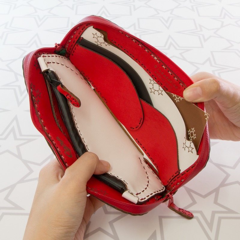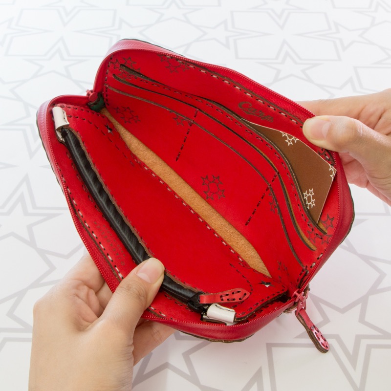 広島東洋カープとのコラボアイテム。真っ赤な球団カラーを基調としたボディに球団ロゴのCマークを両面に配置した、ラウンドジップタイプのロングウォレットです。大きく開くダブルジップで開閉がしやすく、中のカラーリングにもこだわったとっておきのアイテムです。9箇所のカードポケットがついて便利にお使いいただけます。丸みを帯びた折り重なるポケットや弧を描くカットなど、中のデザインにも遊び心を取り入れました。