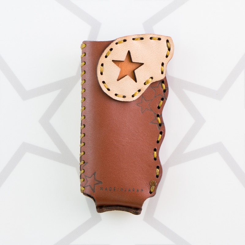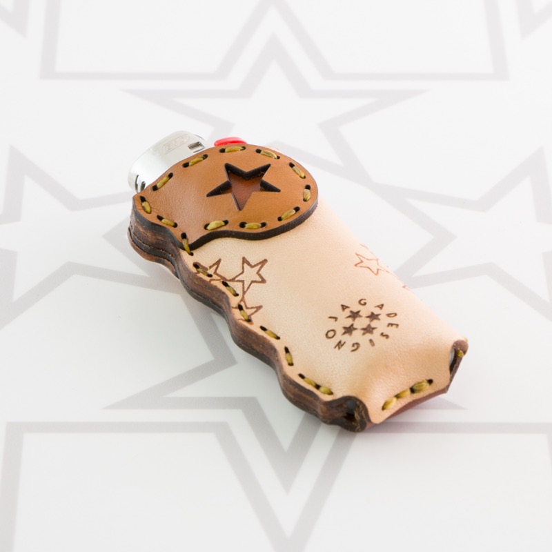 オジャガデザインのロゴマークである五芒星柄がベースとなり、握ったときの手にフィットするフォルムのライターケースです。両面で異なる2つの表情を楽しむことができるものとなっています。BICのライターがぴったり入るサイズです。