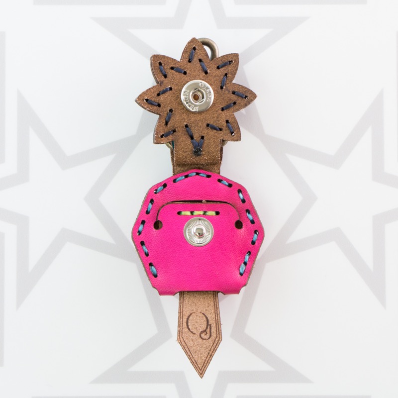 八芒星がデザインされたキーキャップです。三枚の革を重ねて表現した八芒星が印象的な仕上がりとなりました。お手持ちの鍵をおしゃれに彩るだけでなく鍵の目印にもなり、便利なナスカン付きなので、ベルトループ、キーホルダー、ファスナーなどに着けて紛失防止にも役立ちます。