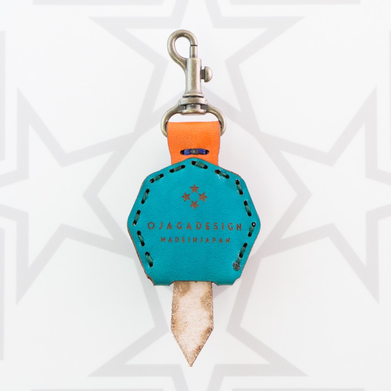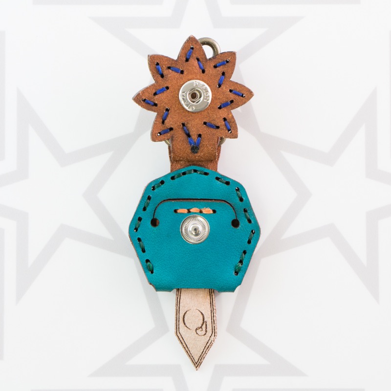 八芒星がデザインされたキーキャップです。三枚の革を重ねて表現した八芒星が印象的な仕上がりとなりました。お手持ちの鍵をおしゃれに彩るだけでなく鍵の目印にもなり、便利なナスカン付きなので、ベルトループ、キーホルダー、ファスナーなどに着けて紛失防止にも役立ちます。