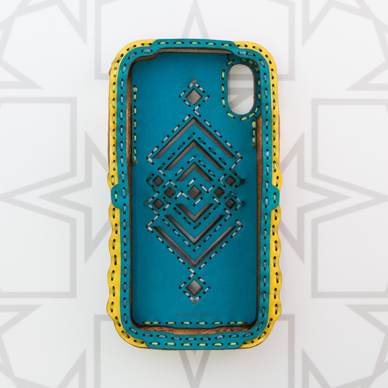 幾何学模様のレザーパーツが幾重にもなった繊細なデザインで、iPhone本体が透けるくり抜きを施したさりげない遊び心がポイント。