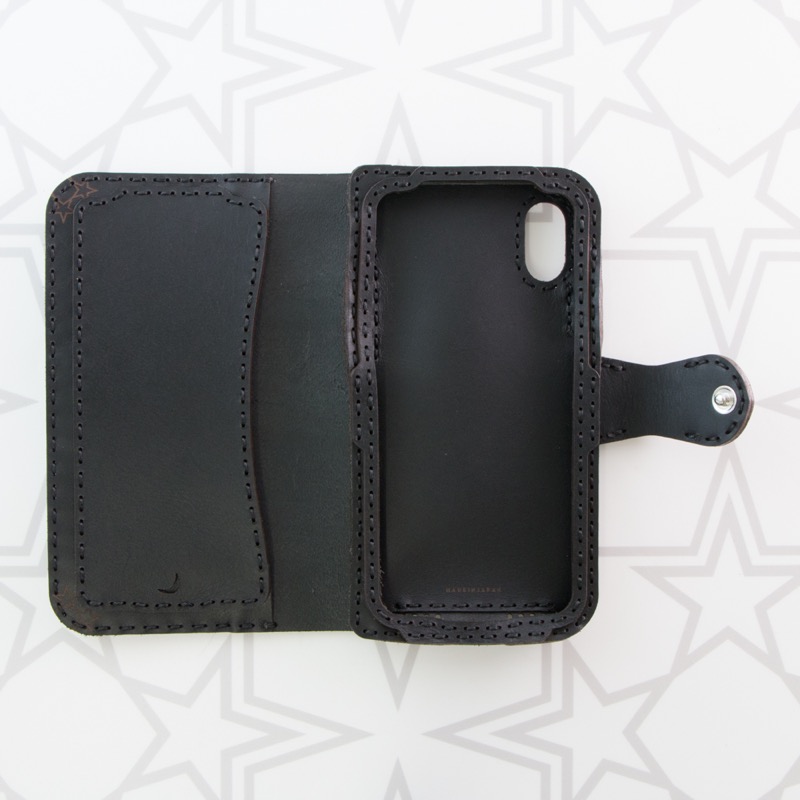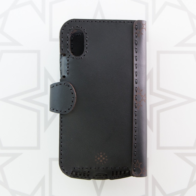 ダイアリータイプのiPhone X/XS用ケースです。表にレザーの切り返しが入り、星でくり抜かれたベルトが付いた、シンプルで使いやすいデザインに仕上がりました。表面にモスクを彷彿とさせるカッティングを施した、オジャガらしいアイテムです。フタの裏にはカードなどが入るポケットが付き、便利にお使いいただけます。iPhoneの側面をすべてレザーで覆った保護性の高いデザインです。※お使いの充電器によってはワイヤレス充電機能がお使いいただけない場合がございます。予めご了承下さい。