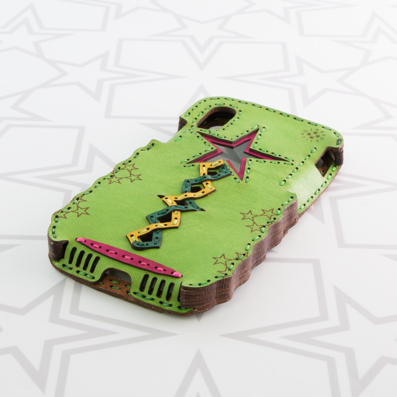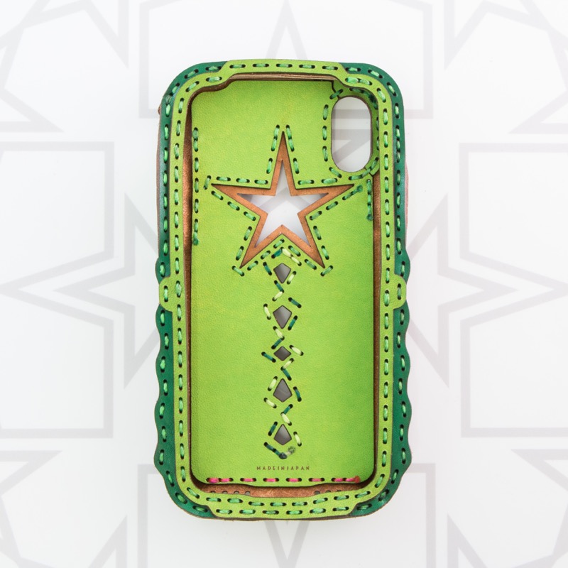 Appleマークが覗く大きな五芒星と個性的なカットが目を惹くデザインは、iPhone本体が透けるくり抜きを施したさりげない遊び心がポイント。