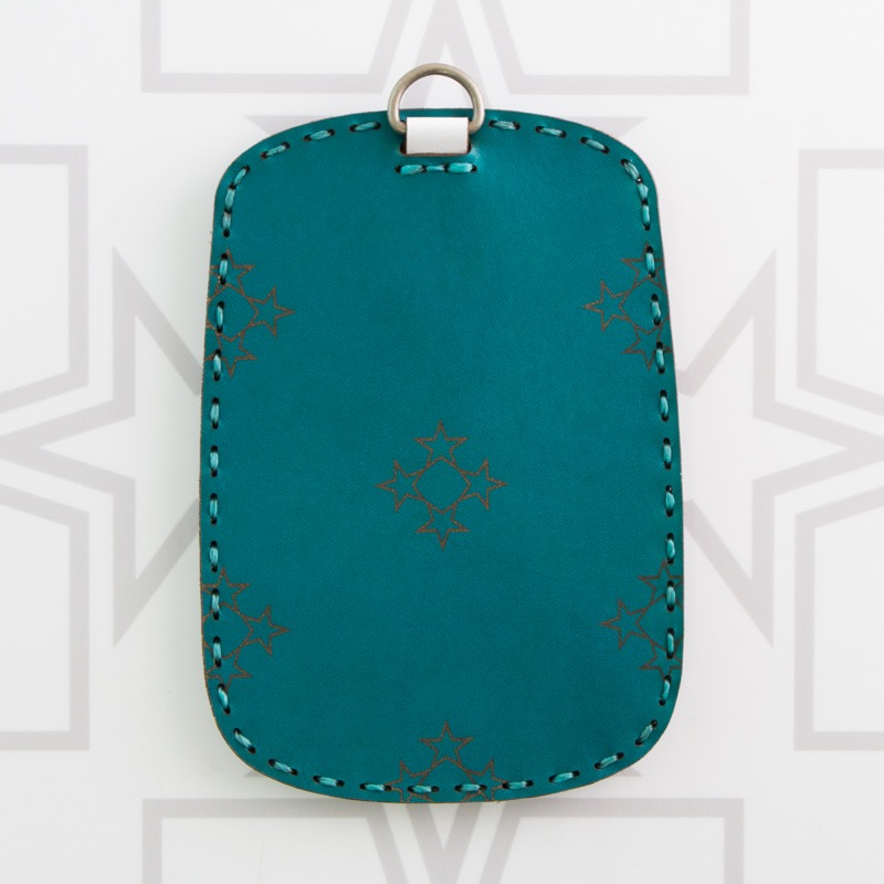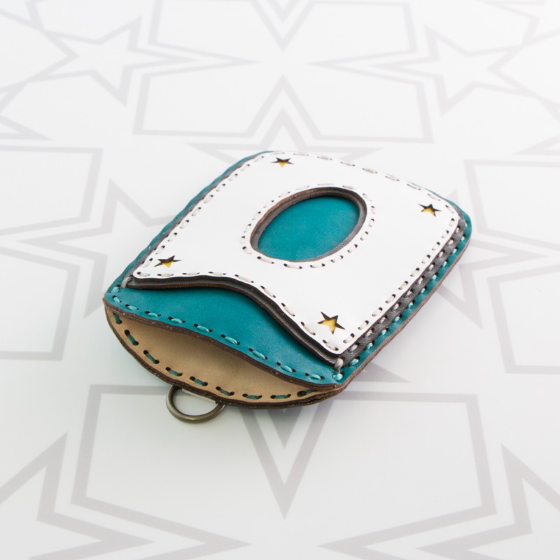 四隅に小さな星を配置したシンプルな新デザインのパスケースです。丸みのある個性的なフォルムがオジャガらしい仕上がりになりました。ポケットが2箇所付き、カードの取り出しがしやすいように外ポケットには楕円形のくり抜きを施しました。裏面にDカンが付いているので、通勤や通学で便利にお使いいただけます。