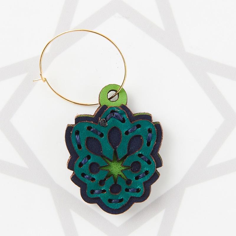 新デザインのフープピアスです。幾何学模様やフォークロア柄をイメージさせる独特なモチーフをアイコンにし、さりげないパンチングが目を惹くデザインです。華奢でシンプルな細い線のフープピアスを使用しているのでモチーフが目立ち、細いフープと個性的なモチーフが絶妙なバランスに仕上がりました。表裏それぞれ異なったカラーリングなので、リバーシブルでお楽しみ頂けます。片耳用なので、左右違ったデザインでのコーディネートもおすすめです。