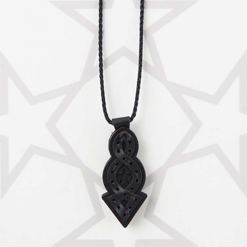 新デザインのネックレスです。幾何学模様やフォークロア柄をイメージさせる独特なモチーフをアイコンにし、編み込みのような革の重なりが目を惹くデザインです。表裏それぞれ異なったカラーリングなので、リバーシブルでお楽しみ頂けます。紐部分のレザービーズで紐をお好みの長さに調整出来る仕様となっております。