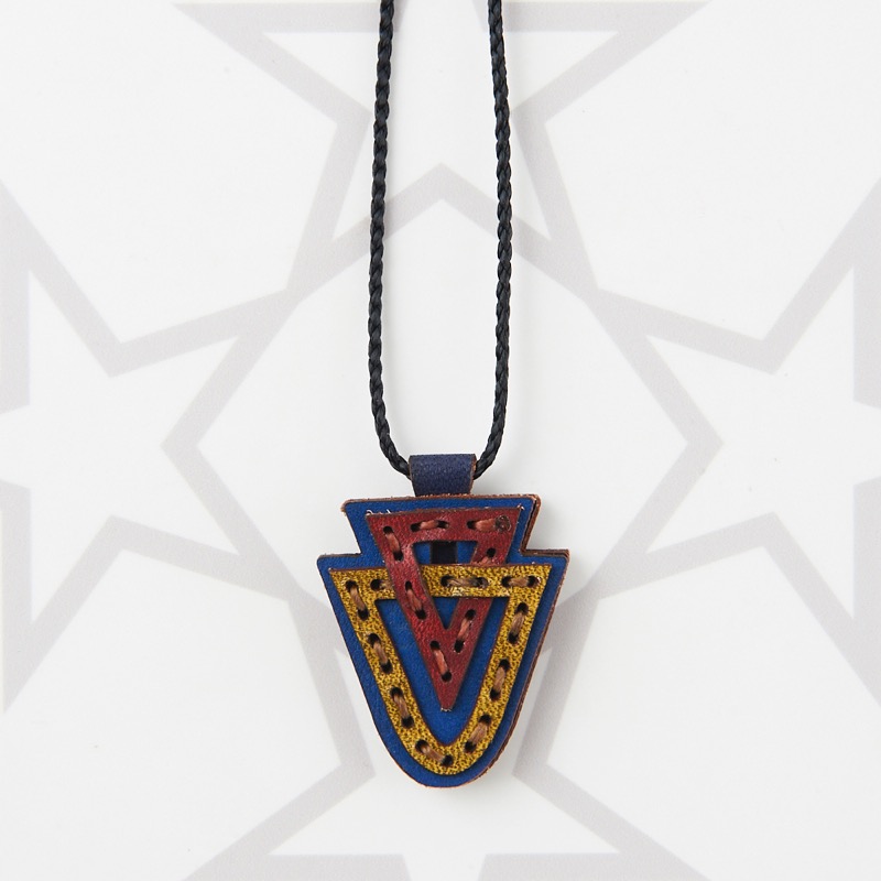 新デザインのネックレスです。幾何学模様やフォークロア柄をイメージさせる独特なモチーフをアイコンにし、編み込みのような革の重なりと星のくり抜きが目を惹くデザインです。表裏それぞれ異なったカラーリングなので、リバーシブルでお楽しみ頂けます。紐部分のレザービーズで紐をお好みの長さに調整出来る仕様となっております。