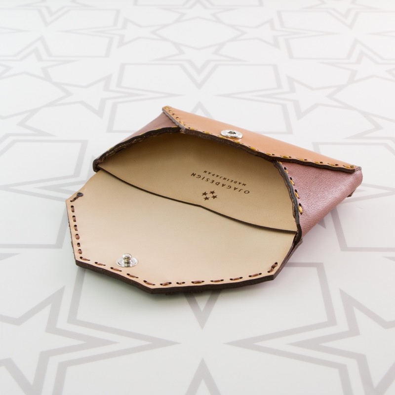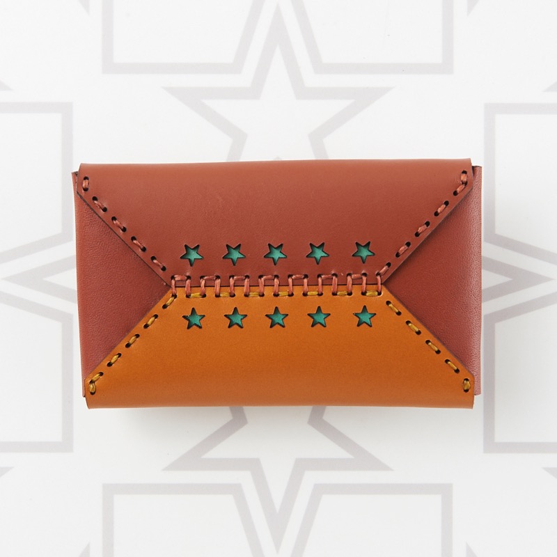 編み込み風のデザインを施したエンベロープ型のカードケースです。裏面に小さな星のくり抜きを並べて配置し、表だけでなく裏面のデザインにもこだわりました。大きく開く二ヶ所のポケットで見やすさを重視し、内側にも革を張ることで取り出しやすさも追求。名刺を約30枚入れてもスッと取り出せるので、カードケースとしてはもちろん、名刺入れとしてのご使用もおすすめです。手にしっくりと馴染むコンパクトなサイズ感も魅力のひとつ。