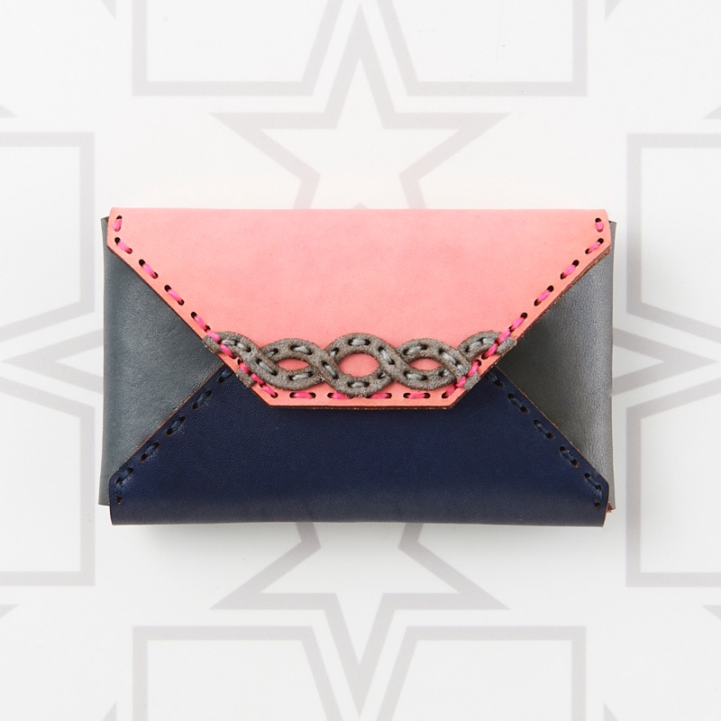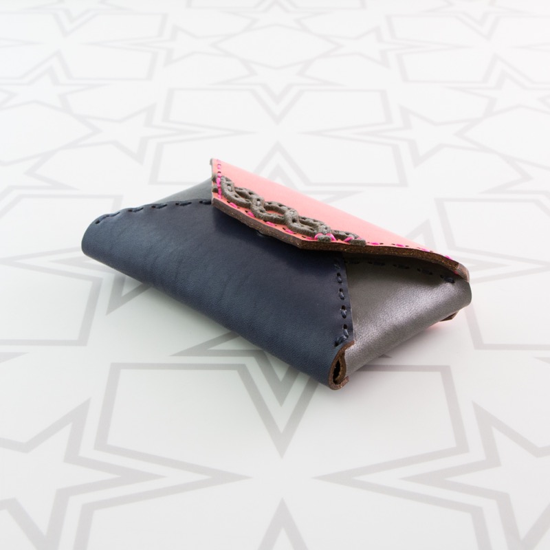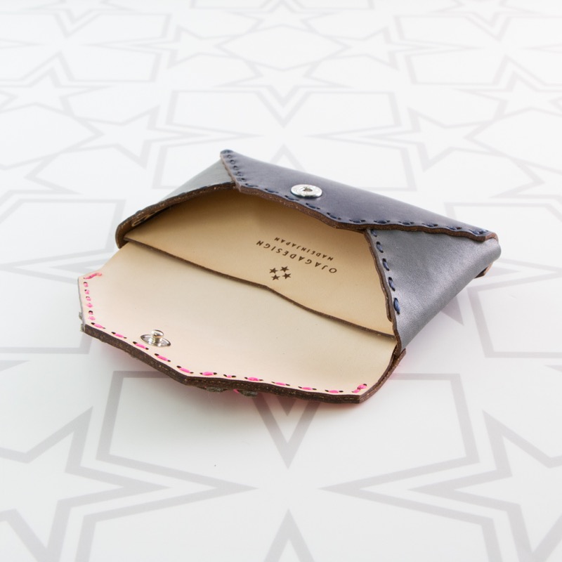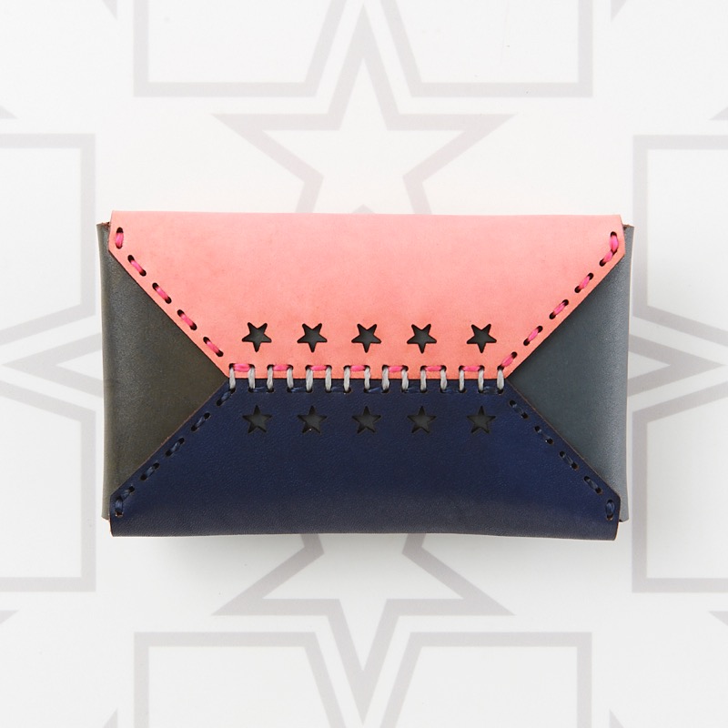 編み込み風のデザインを施したエンベロープ型のカードケースです。裏面に小さな星のくり抜きを並べて配置し、表だけでなく裏面のデザインにもこだわりました。大きく開く二ヶ所のポケットで見やすさを重視し、内側にも革を張ることで取り出しやすさも追求。名刺を約30枚入れてもスッと取り出せるので、カードケースとしてはもちろん、名刺入れとしてのご使用もおすすめです。手にしっくりと馴染むコンパクトなサイズ感も魅力のひとつ。