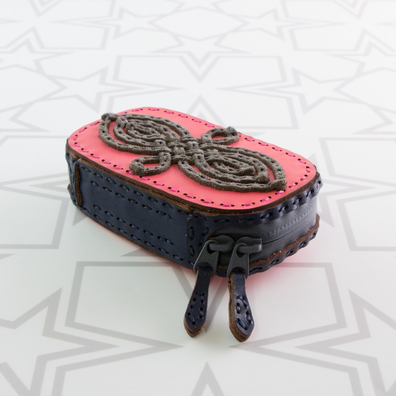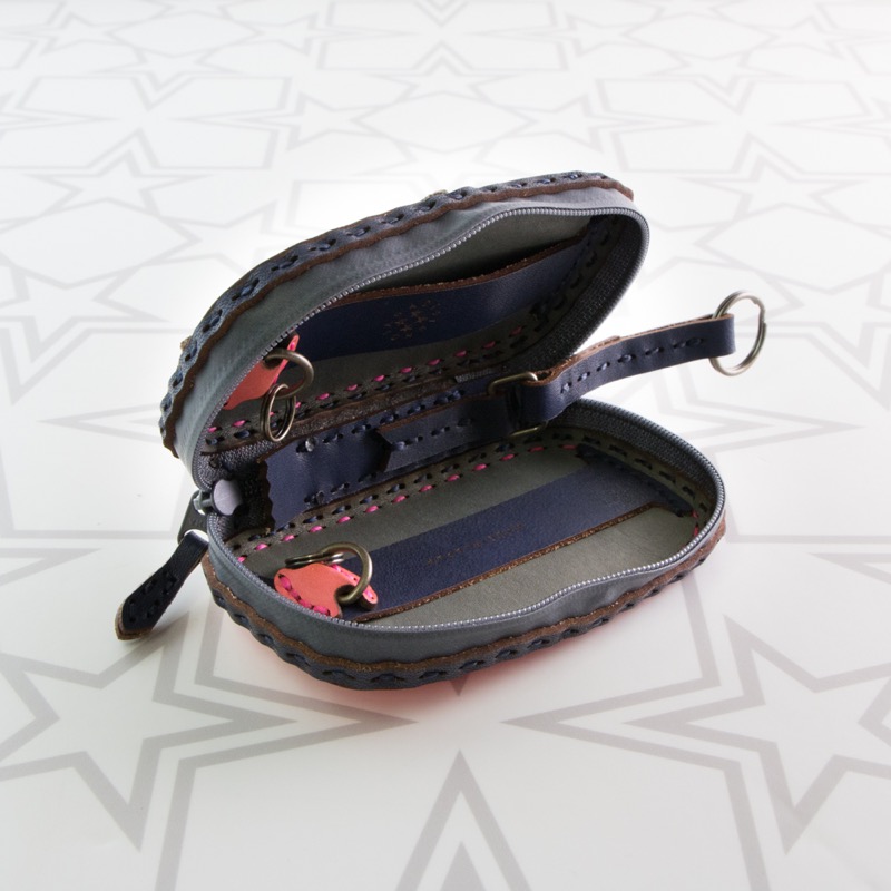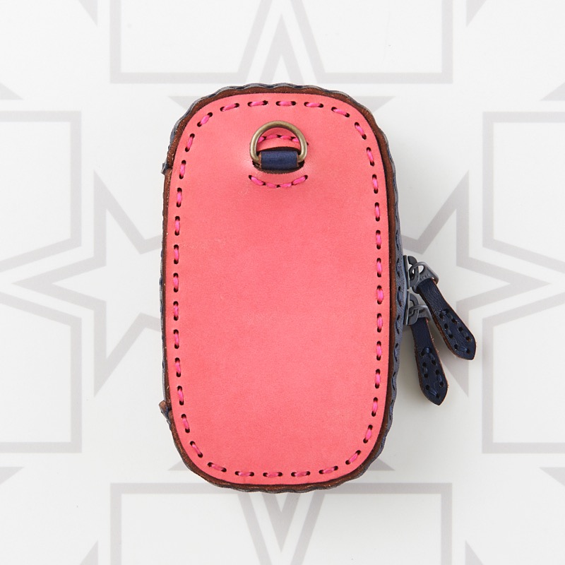 編み込み風のデザインを施したキーケースです。ダブルジップのラウンドファスナーと厚めのマチを付けることで中身を大切に保護するだけでなく、たくさんの鍵はもちろん、車用のスマートキーや厚みのあるノンタッチキーも収納が可能。よく使う鍵はレザーコード付きの二重リングに着けることで、鍵の開閉もスマートに。内側にはカードが収納できるようになっているので、駐車券やICカード、カードキーなどを入れられます。背面のDカンにはキーホルダーを着けたり、ベルトループと繋いだりと、カスタムしてお使い下さい。