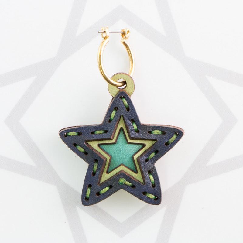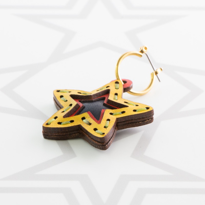 五芒星型の片耳用ピアスです。三枚の革を重ねた存在感のある仕上がりは、ファッションのアクセントに最適です。表裏それぞれ異なったカラーリングなので、リバーシブルでお楽しみ頂けます。片耳用なので、左右違ったデザインでのコーディネートもおすすめです。