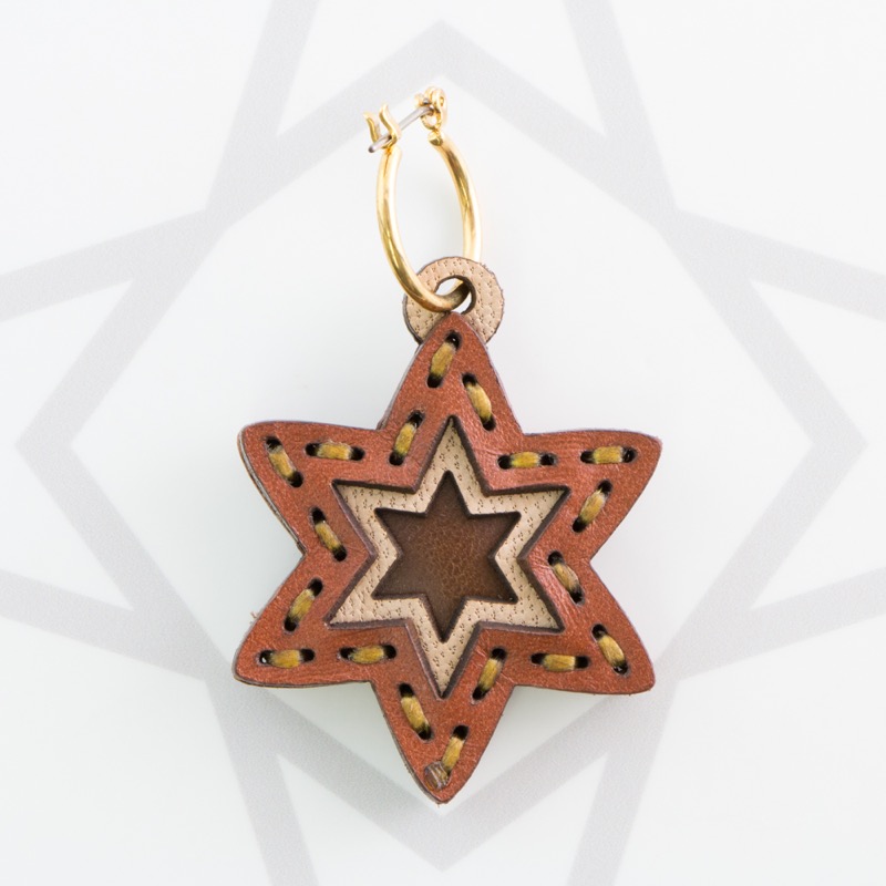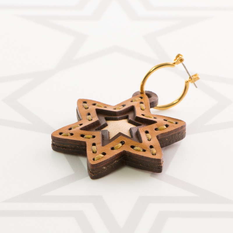 六芒星型の片耳用ピアスです。三枚の革を重ねた存在感のある仕上がりは、ファッションのアクセントに最適です。表裏それぞれ異なったカラーリングなので、リバーシブルでお楽しみ頂けます。片耳用なので、左右違ったデザインでのコーディネートもおすすめです。
