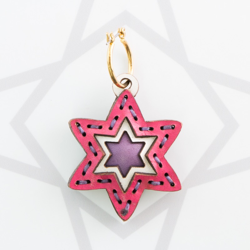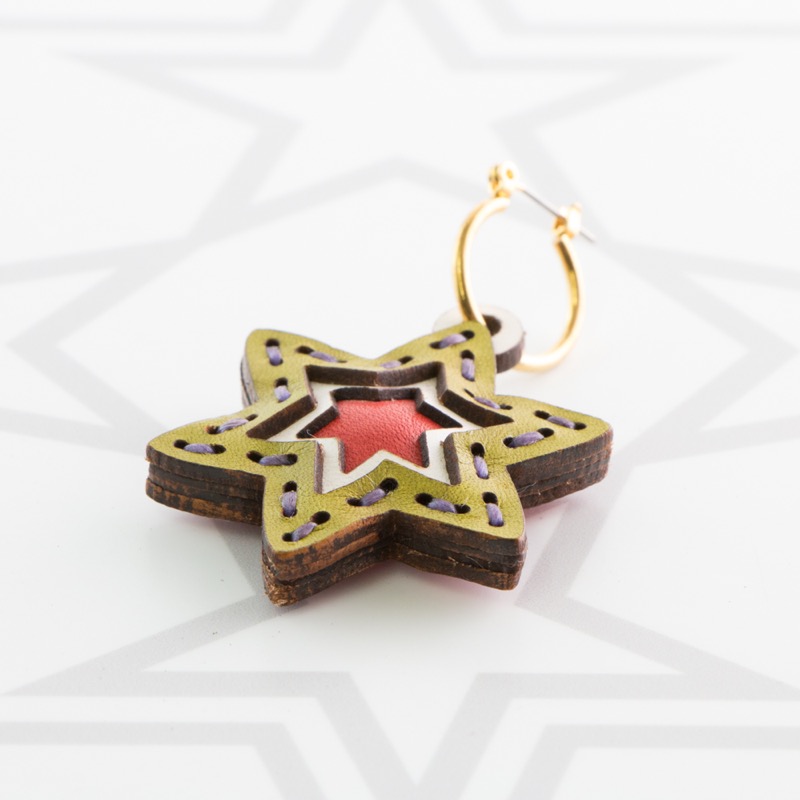 六芒星型の片耳用ピアスです。三枚の革を重ねた存在感のある仕上がりは、ファッションのアクセントに最適です。表裏それぞれ異なったカラーリングなので、リバーシブルでお楽しみ頂けます。片耳用なので、左右違ったデザインでのコーディネートもおすすめです。