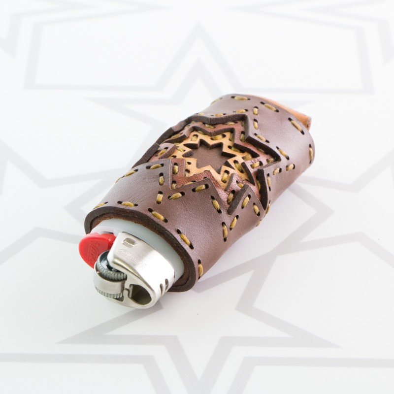 レザーを贅沢に4枚重ね、八芒星を表現したライターケースです。繊細なレザーのカッティングと細かなステッチで、高級感のある仕上がりとなりました。BICのライターがぴったり入るサイズです。