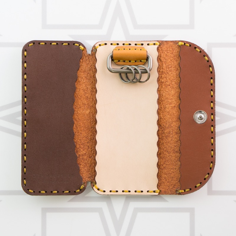 シンプルなデザインを施したキーケースです。レザーの色をお楽しみいただけるよう、シンプルに焼印のみを施し、ポケットにも入るすっきりとしたフォルムに仕上がりました。中には二重リングが3つ付いており、複数の鍵が着けられます。