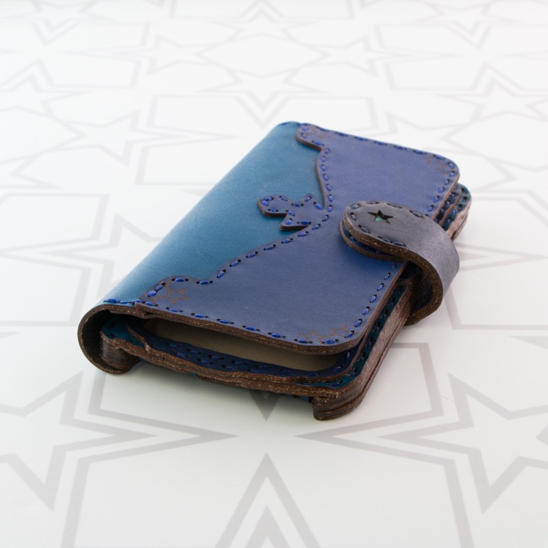 表にレザーの切り返しが入り、星でくり抜かれたベルトが付いた、シンプルで使いやすいデザインに仕上がりました。