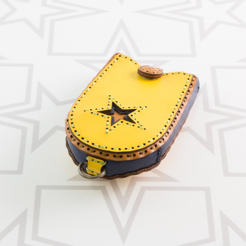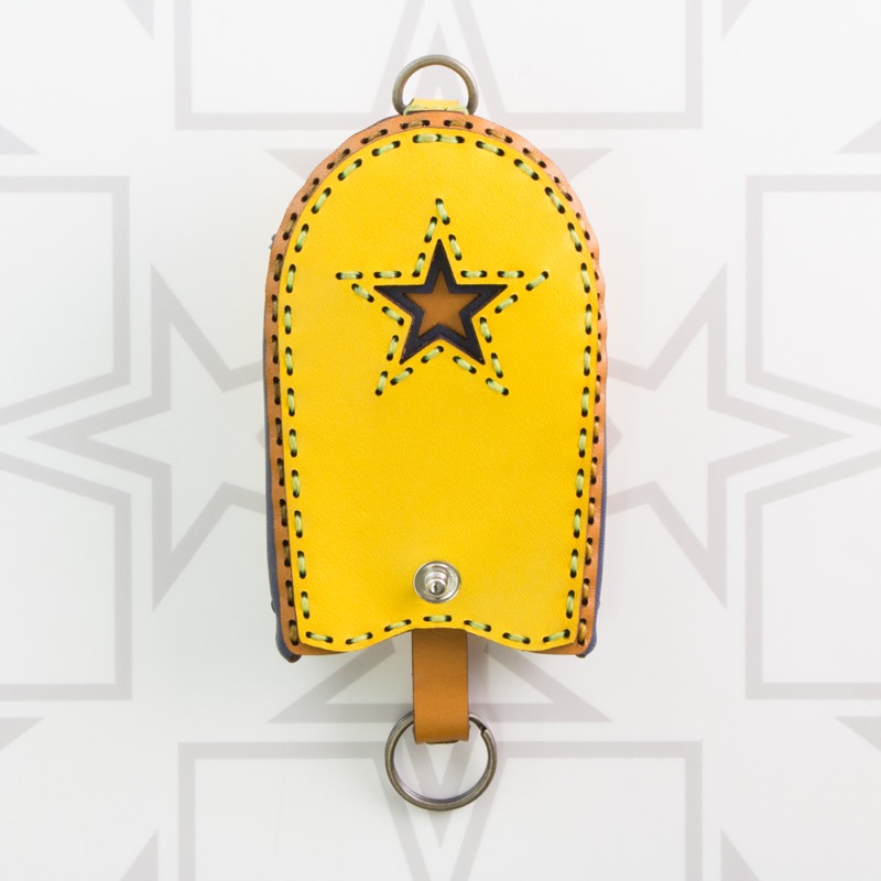 新アイテムのキーケースです。スナップボタンを外すとベルトが下がってくる仕組みになっており、ベルトの先の二重リングに鍵を付けて、鍵を引き出して使うベル型です。ケースに厚みがあるので複数の鍵、スマートキーやセンサーキーなども着けられます。大きな五芒星がポイントになったオジャガデザインらしいアイテムです。