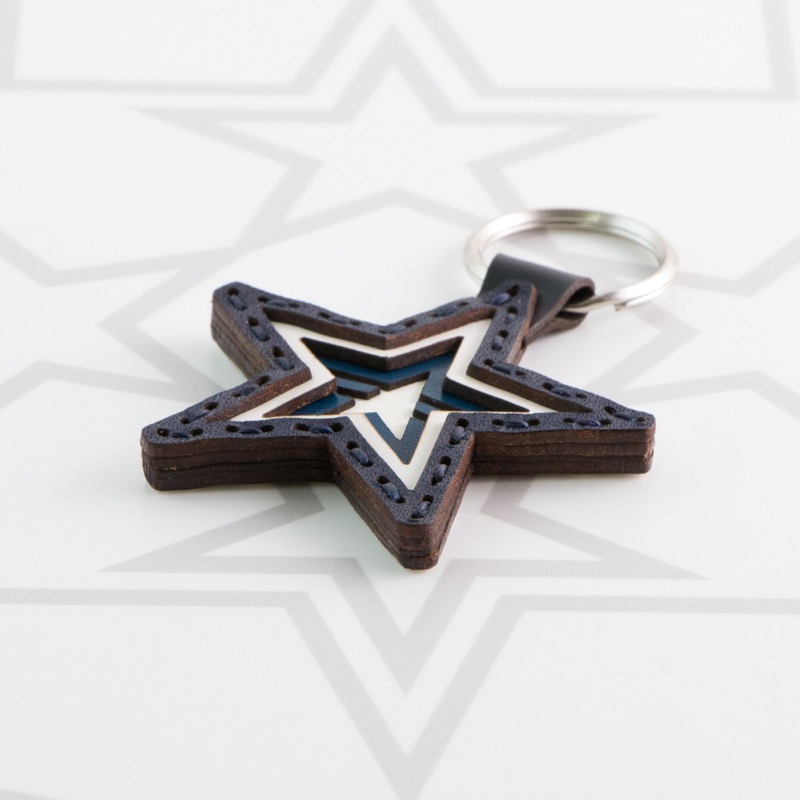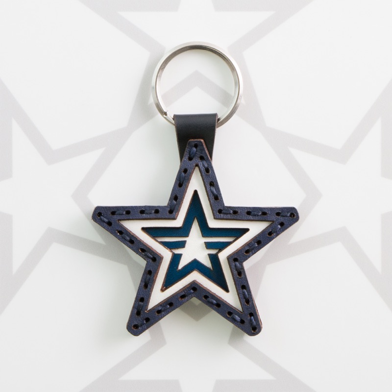 横浜DeNAベイスターズのアイテム。シンボルマークのスターロゴをレザーを幾重にも重ねることで表現した二重リングタイプのキーホルダーです。さりげなくファンをアピールできる、普段使いに最適なアイテムに仕上がりました。球団カラーのブルーと、ペールブルー、ネイビーの計3色展開。同コレクションのキーキャップとコーディネートしてのご使用がおすすめです。