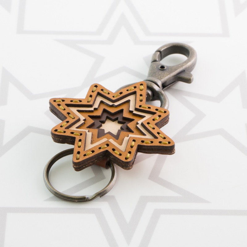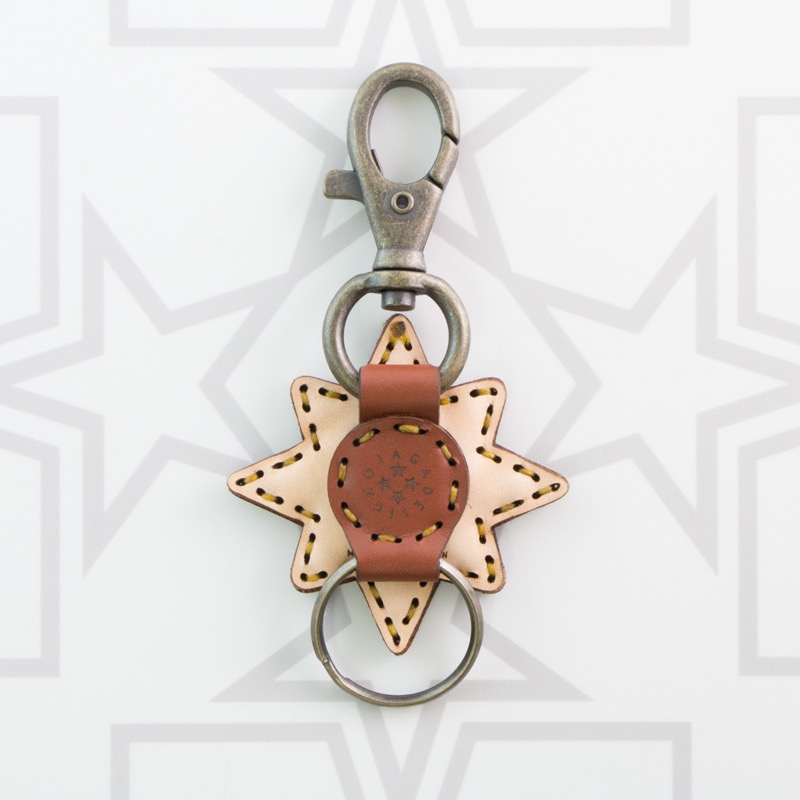 新作のキーホルダーが登場。ベルトループやバッグなどに簡単に着脱が出来るナスカンと、キーキャップや鍵を着けることが出来る二重リングが着いた便利な仕様です。革を幾重にも重ねて八芒星を型取り、インパクトのあるデザインに仕上がりました。お気に入りのキーキャップと合わせてコーディネートをお楽しみ下さい。